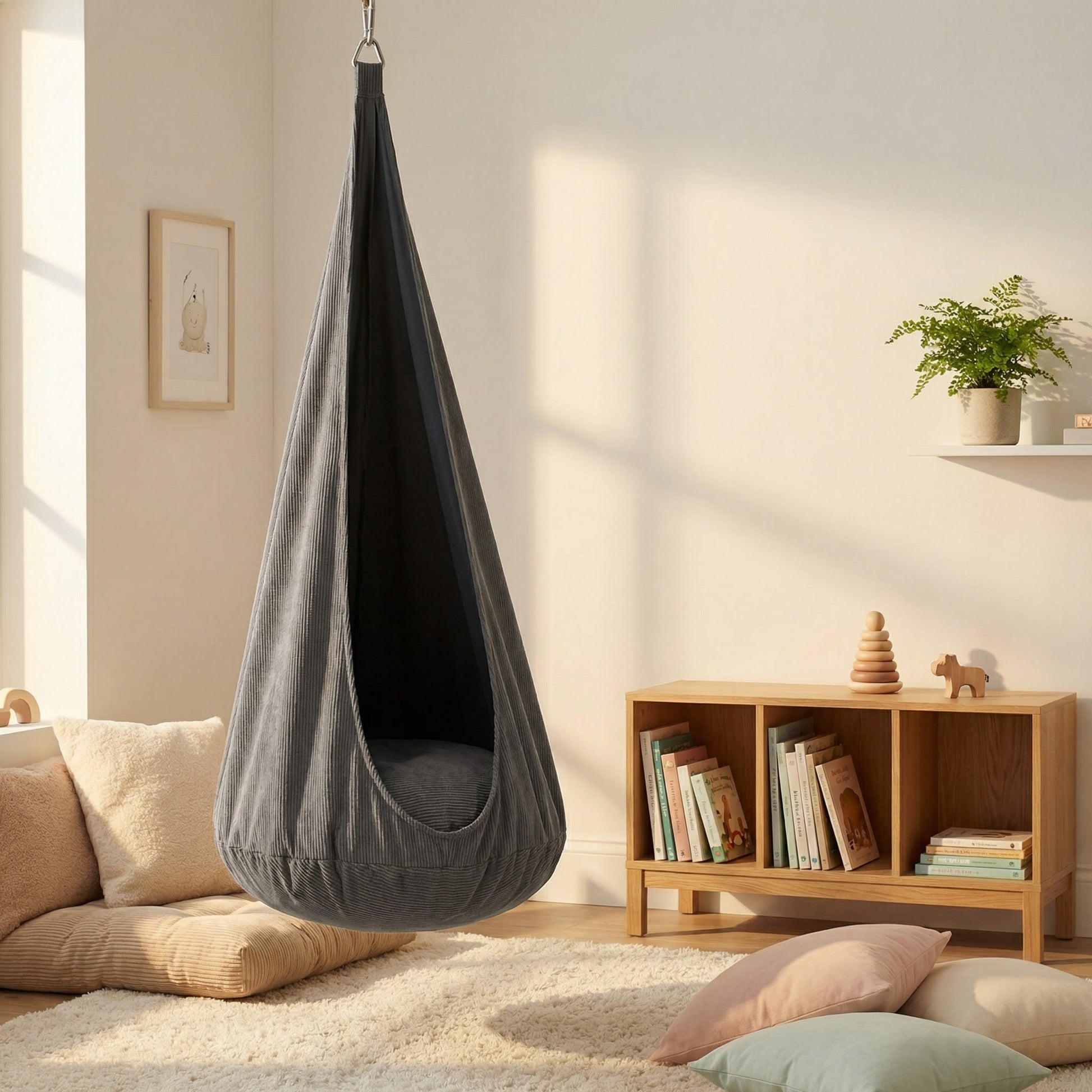 In tegenstelling tot harde plastic schommels, biedt deze zachte cocoon swing een veilige, omhullende ervaring. De zachte beweging helpt kinderen kalmeren en focussen - ideaal voor na school of voor het slapengaan. De Graphite Shadow kleur geeft een moderne, stoere touch aan elke kinderkamer.
